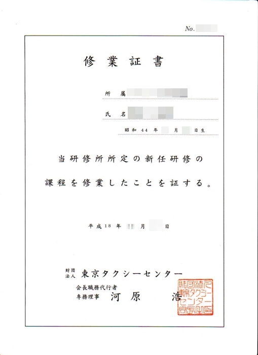 今日で、3日間のタクシーセンターでの研修を終え、修業証書もいただました。