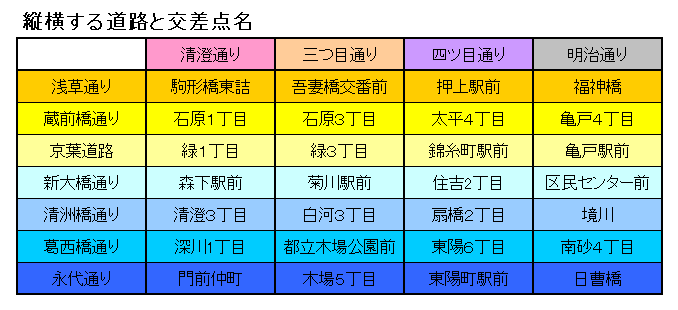(例:加平→6号三郷線・常磐自動車道、錦糸町→7号小松川線・京葉道路など)